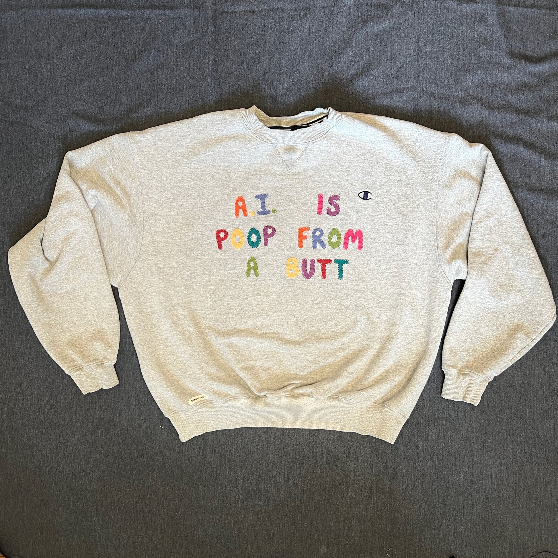 Shirts are secondhand, found in local thrift stores and letters are made from secondhand materials; they are hand cut and hand sewn onto the shirts.