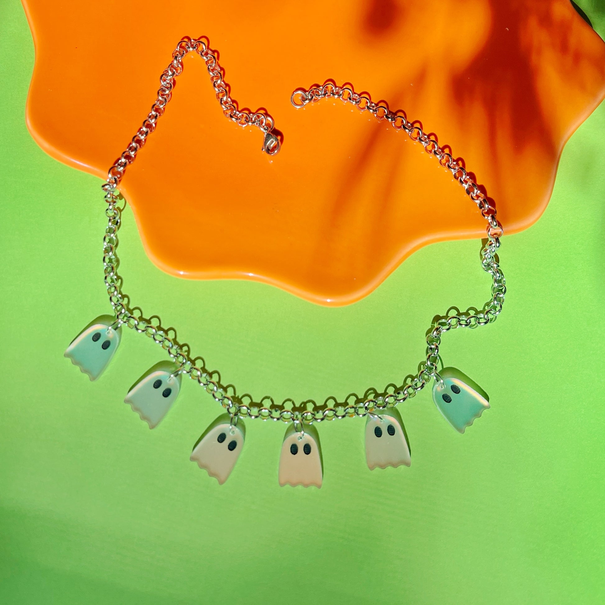 Each necklace is made by hand. They are made from acrylic, which means they are very lightweight. Chain is stainless steel.